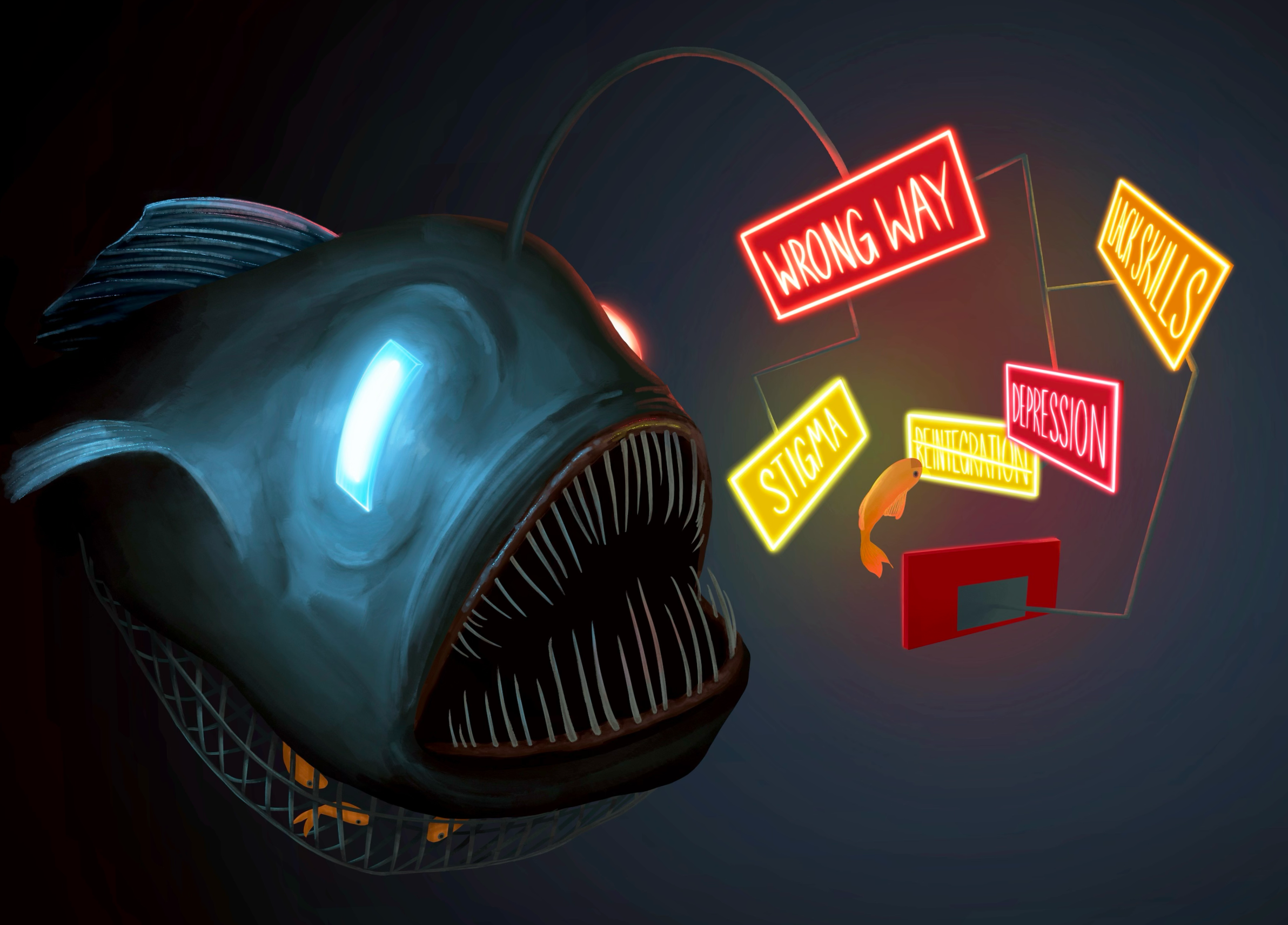 Painting of an anglerfish symbolizing the intentionally cyclical nature of the American prison system.